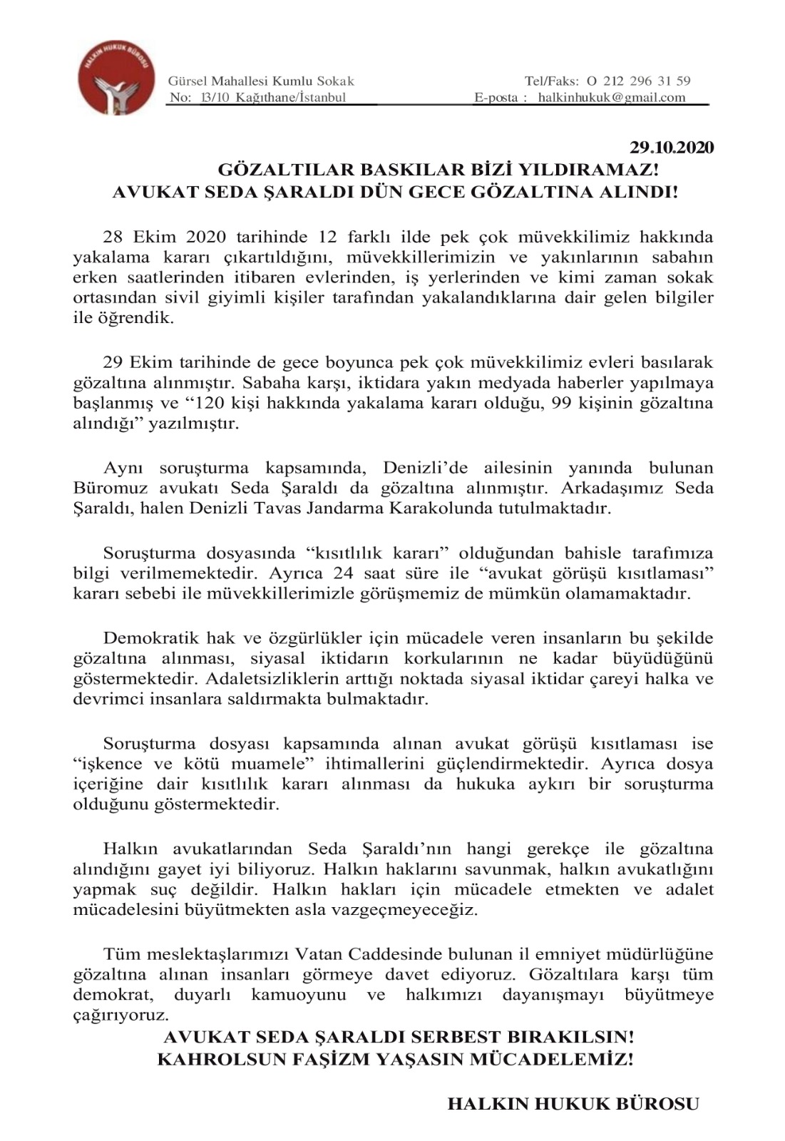 Halkin Hukuk Burosu On Twitter Gozaltilar Baskilar Bizi Yildiramaz Avukat Seda Saraldi Dun Gece Gozalti Alindi 120 Kisi Hakkinda Yakalama Karari Verildi 99 Kisi Gozaltinda Avukat Seda Saraldi Derhal Serbest Birakilsin Tum